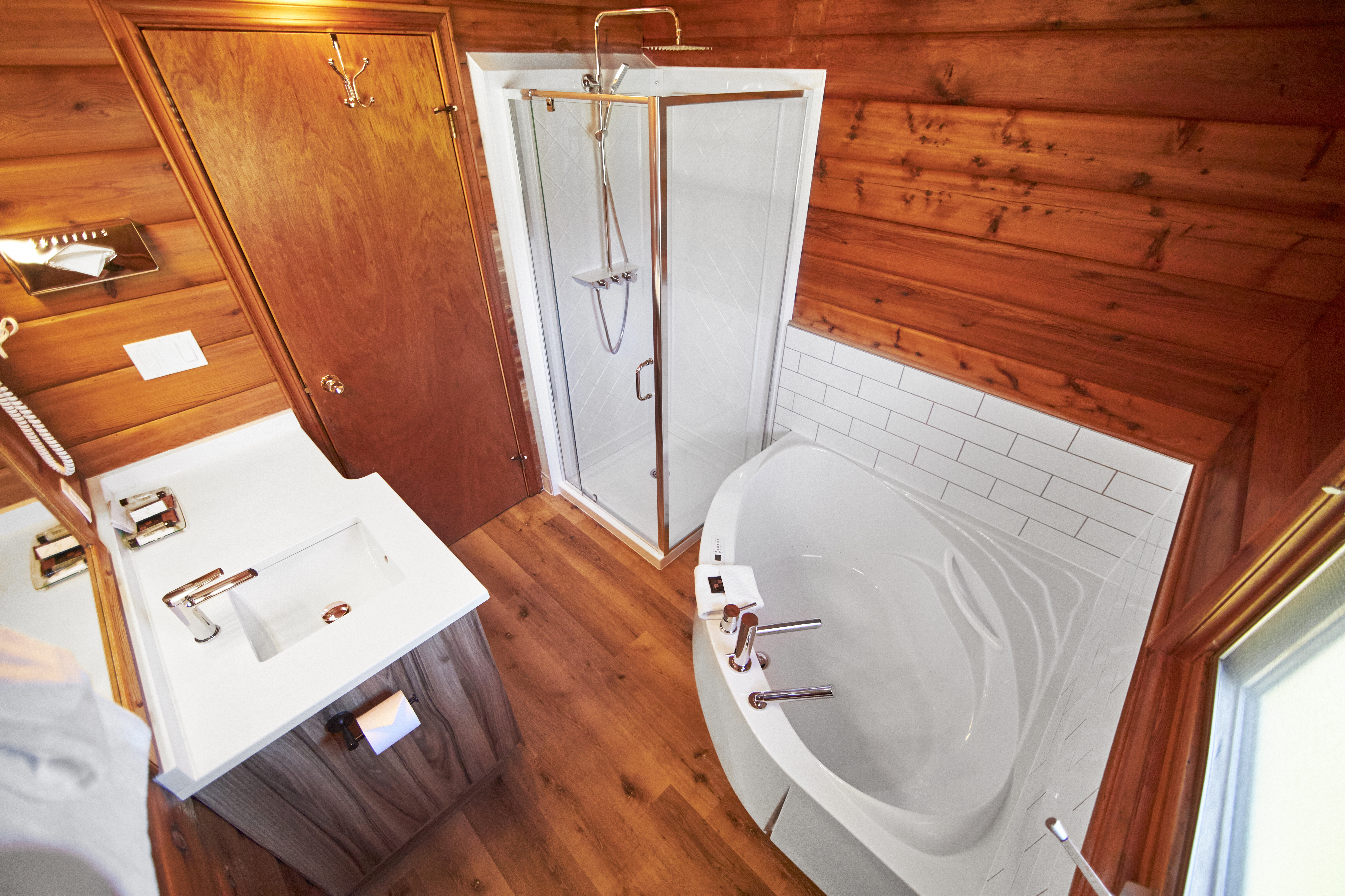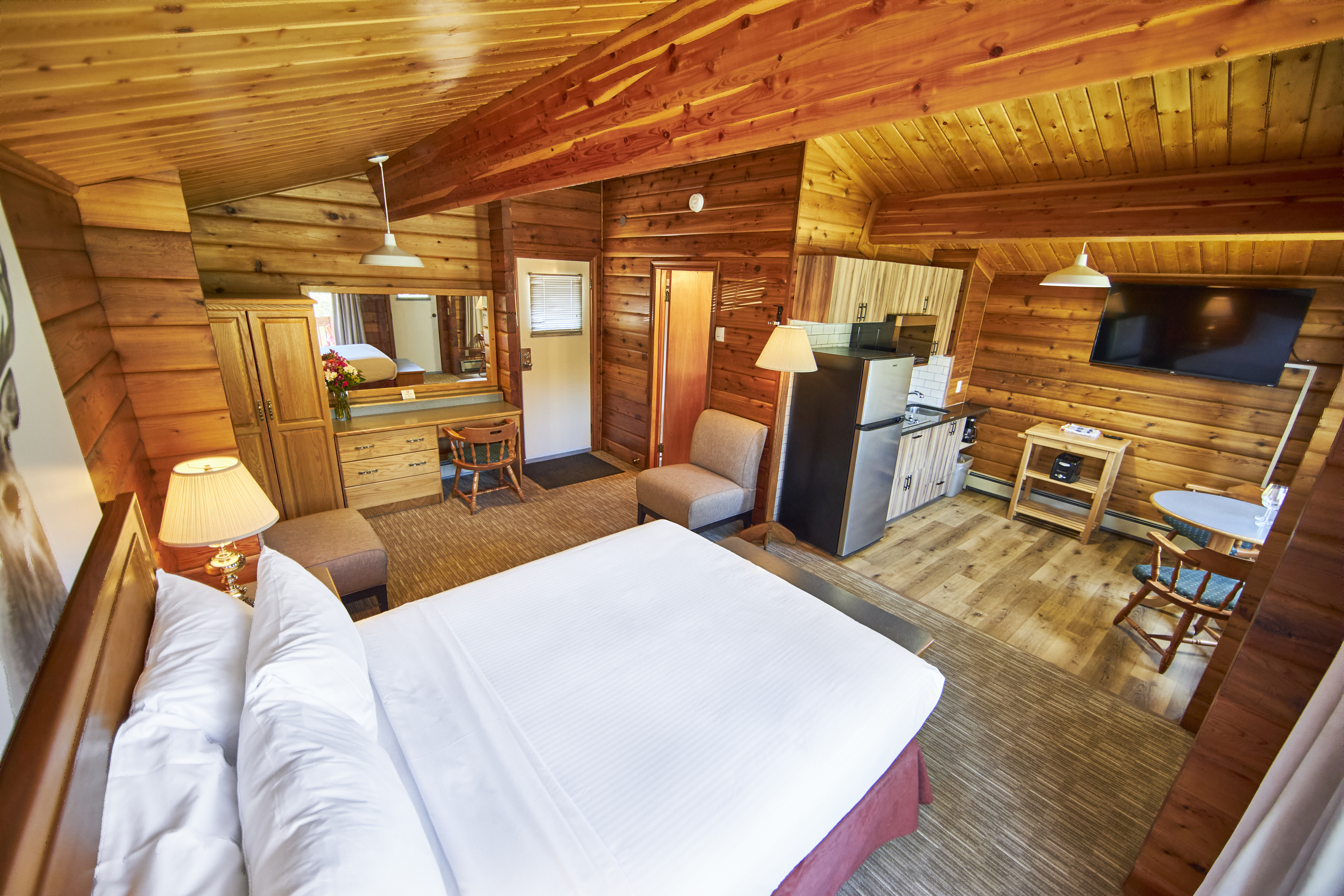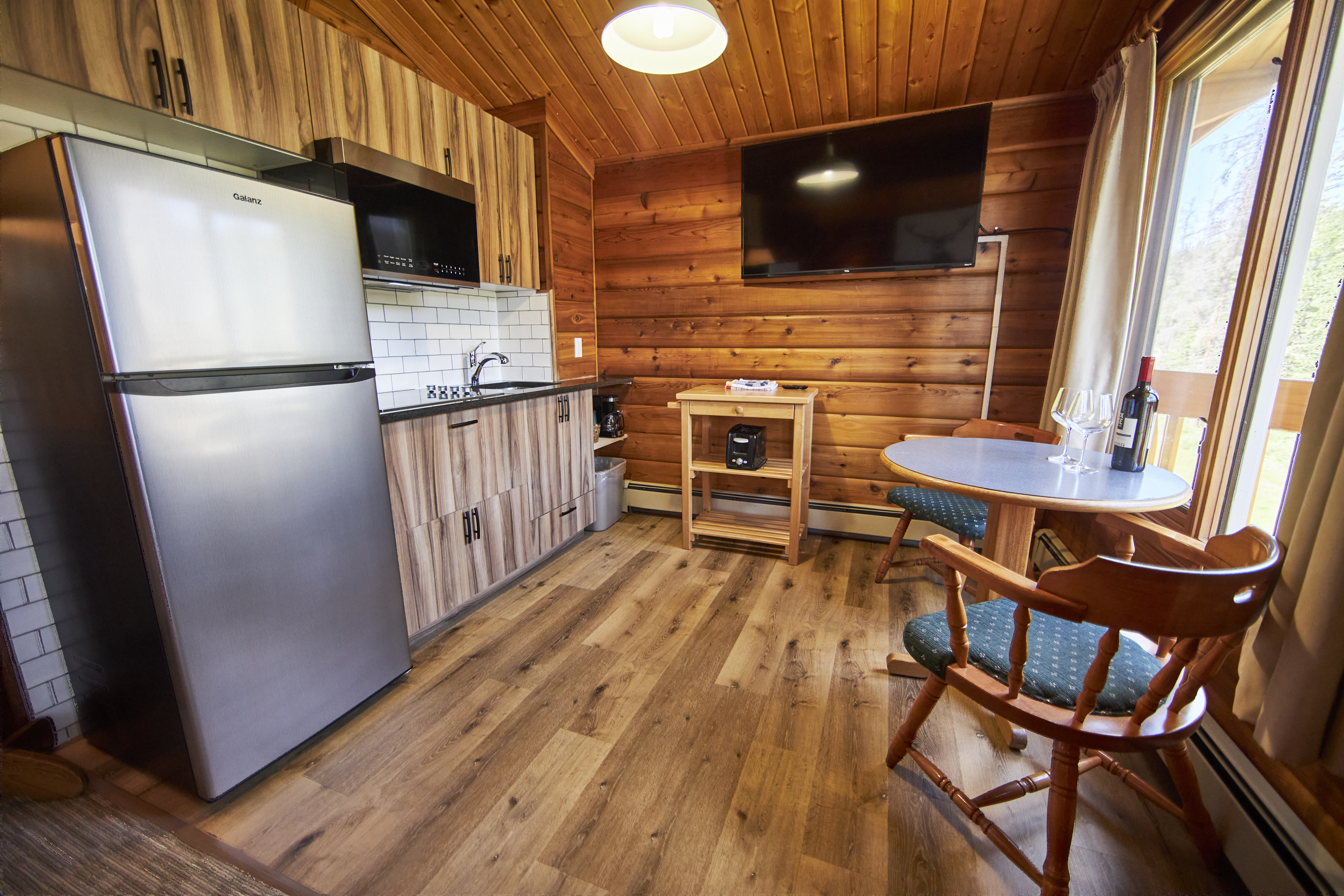 The Executive Chalet is equipped with a plush queen bed, large flat screen TV and a private balcony facing the river with Adirondack chairs. The renovated kitchenette is equipped with an apartment size fridge, toaster, microwave, 4 burner stove top and coffee maker. Complimentary coffee and tea are provided daily. Standard kitchen dishware and utensil are provided. There is a full upgraded bathroom with a heated air jet tub, stand-up shower, hairdryer, bathroom amenities, towels and linens. Our Executive Chalet is up one flight of stairs, has 1 parking spot, and is pet-free and non-smoking.
